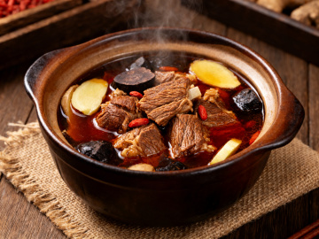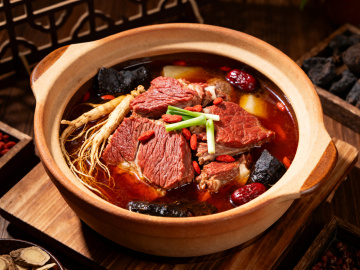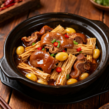 重拟物风呈现热辣沸腾的中式火锅,油光溢彩,蒸汽缭绕,辣椒与牛肚在光影中跃动,质朴木桌衬托实景感,如油画般浓郁。