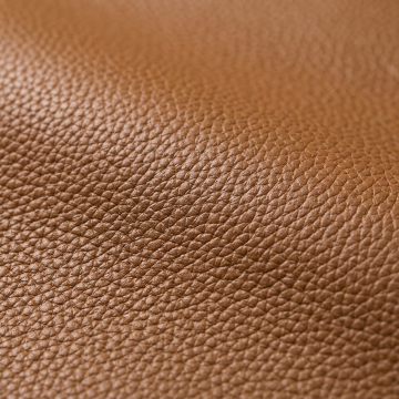 一张高品质的棕色皮革材质特写,皮革表面呈现出细腻且自然的荔枝纹肌理,纹理清晰饱满,具有真实的皮革质感。整体色调为温暖的棕黄色,光线均匀柔和地洒在皮革表面,形成细微的明暗过渡,展现出皮革本身的光泽感和温润触感,材质细节丰富,没有任何文字、图案或装饰元素,纯粹的皮革背景。