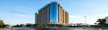 一张豪华酒店的黄昏外景摄影照片,展现不同的酒店场景图,宏伟的现代风格高层建筑,外立面采用深色石材与大面积玻璃窗相结合,顶部及裙楼边缘有温暖的金黄色LED灯带勾勒轮廓,建筑底部有整齐排列的户外遮阳伞与休闲座椅区域,周围环绕着茂密的绿色乔木,前方是平静的水池,完美倒映出建筑的灯光与天空的渐变色,天空呈现从顶部深邃的靛蓝色逐渐过渡到地平线附近柔和的青蓝色的黄昏景象,整体光影柔和,色彩和谐,营造出高端、宁静、奢华的氛围,细节清晰,质感真实,具有强烈的空间纵深感和视觉冲击力。
