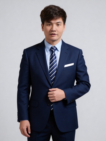 商务感十足的藏蓝色西装,斜条纹蓝白相间领带男性职业形象照,面料质感细腻,实景拍摄呈现高级质感,适合职场精英形象展示。