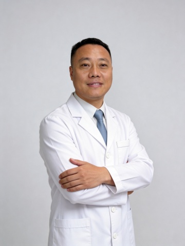 一位亚洲男性医生,身着洁白挺括的医生白大褂,内搭白色衬衫并系着深蓝色领带,胸前挂着银色听诊器,双臂交叉于胸前,站姿挺拔自信,戴着一副细框眼镜,眼神沉稳专注,面带温和从容的微笑。背景设定为医院环境,可包含柔和灯光下的白色墙面、模糊的医疗设备轮廓或带有简约线条的医院走廊元素,整体画面采用高清写实风格,光线明亮柔和,色彩以白色和浅色调为主,营造出专业、可靠且略带温馨的医疗氛围,构图采用经典人像布局,人物主体清晰突出,细节刻画精致。