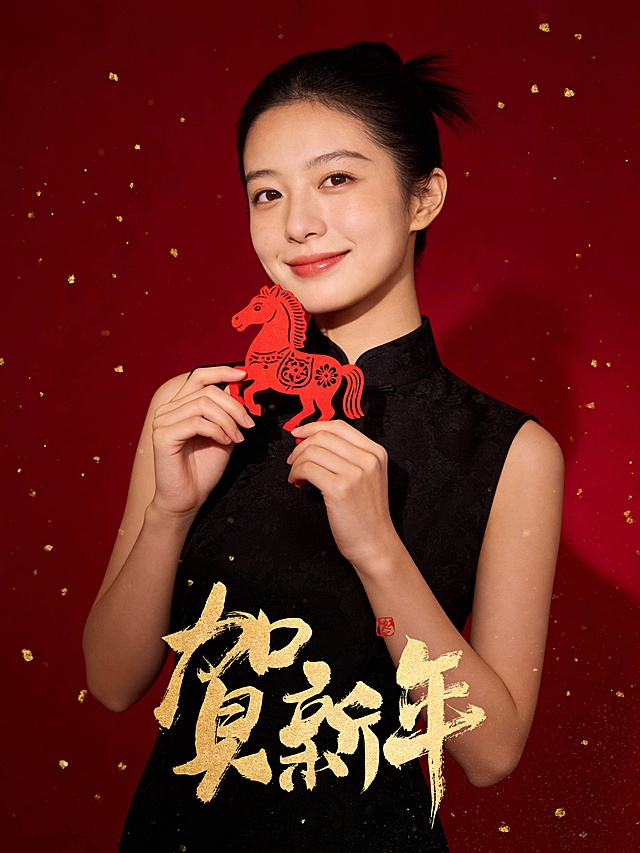 国潮风融合水墨马影,红黑双色设计彰显喜庆与中式韵味,手持“马到成功”折扇,传递新春祝福。详情