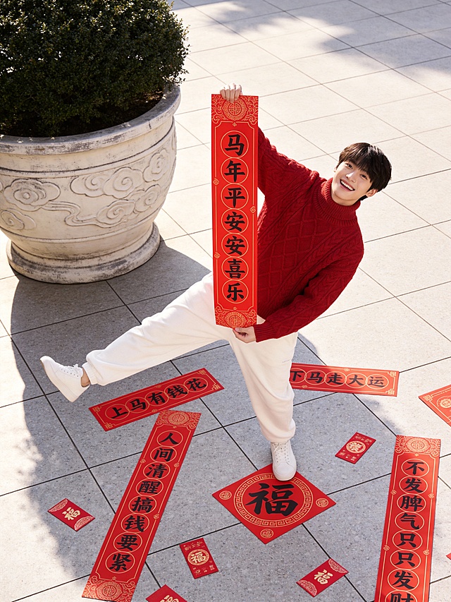 国潮风新春大片,红毛衣配围巾尽显中式喜庆,实景布景融合灯笼与“福”字,面料质感突出,节日氛围浓厚。详情