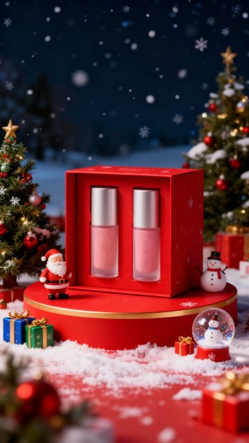 3D风玻璃球内嵌金属质感口红,融合喜庆红金配色与温馨灯光,营造奢华时尚圣诞氛围。