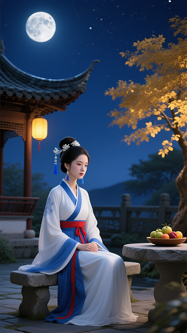 古风浪漫深情星河,女子立于庭院中,仰头望月,月光洒满她的衣襟与发丝。夜空中星辰如碎钻散布,画面略带清冷感,但月光柔和。色调为深蓝、月白与淡紫,无任何文字详情