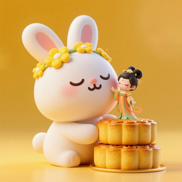 可爱感与梦幻感交融的中式插画风,结合撕纸与剪纸元素,软3D质感呈现中秋佳节温馨场景,少女提灯伴玉兔,月下花影共团圆。
