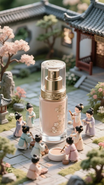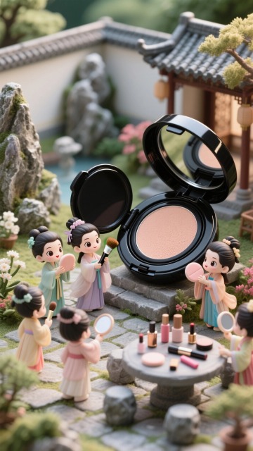 梦幻感与甜美感交织的微缩艺术风场景,3D卡通人物环绕城堡式眼影盘,镜中浮现大眼,粒子飘散如星河,重拟物设计搭配粘土质感,营造虚拟现实般的童话氛围。