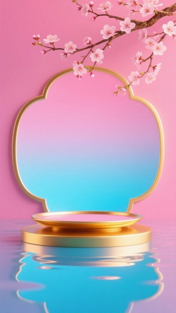 3D渲染风格展台,画面中央放置一个圆形展台,展台基座为金色回纹装饰的白色底座,中间是红色台阶,顶部是红色圆形台面,展台后方是带有金色边框的圆形镂空屏风,屏风两侧有蓝色渐变的山峦造型,左侧有金色镂空窗格和白色玉兰花枝,右侧有白色玉兰花,背景是浅蓝色天空和远处的淡蓝色山峦,点缀着几只飞鸟,整体色调改为以深蓝色和金色为主,搭配白色和少量红色,保持中国风意境和层次感,光影柔和,质感细腻。
