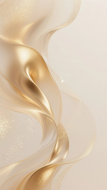一张具有流动感的3D渲染海报,画面主体为飘逸灵动的半透明流体形态,以深蓝、湖蓝和金色渐变为主色调,金色的亮片和闪光点缀在流体的边缘和转折处,营造出优雅、奢华、现代的氛围。流体形态呈现出自然的波浪状曲线,光影效果柔和,高光部分明亮但不过曝,阴影部分深邃但不沉闷,整体色彩和谐统一,具有强烈的视觉冲击力和艺术美感。