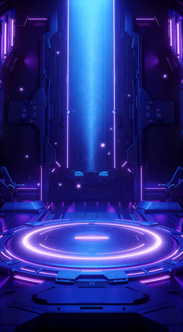 3D渲染的赛博朋克风格科技场景,中央是巨大的发光圆环结构,地面由多条弯曲的发光线条组成,上方悬挂着许多细长的发光条,整体呈现深邃的暗紫色调,霓虹灯光效果强烈,光影对比鲜明,营造出未来感和科技氛围,空间感十足,光线从圆环中心向外扩散,照亮整个场景,线条流畅且富有动感,材质表现为光滑的金属和发光材质的结合。