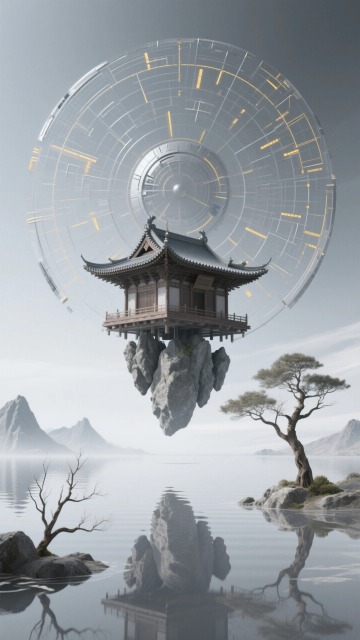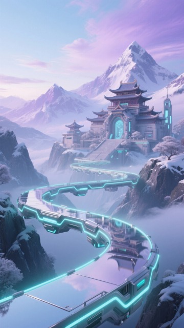 科技感+中国山水风,中国建筑+科技风,前景是镜面水面与金属镜面步道,悬浮的曲面建筑承接一座科技感的古典重檐楼阁(流动波纹,蓝绿渐变光效),后面是未来流动曲面形成的山体颜色是青色,山体边缘是金色,整体色调淡紫+青蓝+金边