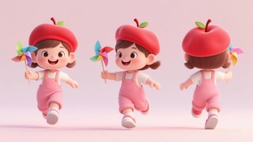 Q版可爱卡通风格儿童系列素材套系,4个不同场景,每个场景中都有一个Q版儿童坐在不同物品上。第一个场景:一个扎着双马尾的小女孩,穿着带有粉色花朵图案的白色连衣裙,蓝色袜子配红色小皮鞋,正开心地坐在黄色纸飞机上,右手举起食指指向天空,眼睛看向手指方向,表情天真可爱,整体呈现出圆润的3D立体效果,色彩明快柔和,边缘光滑无棱角,背景为纯白色。第二个场景:一个Q版儿童坐在一本打开的彩色书本上,书本有明显的书页层次感,儿童穿着与第一个场景风格统一的可爱服饰,表情愉悦,姿态自然。第三个场景:一个Q版儿童坐在弯弯的黄色月亮上,月亮表面有柔和的光泽感,儿童或躺或坐,姿态舒适惬意,服饰保持Q版可爱风格。第四个场景:一个Q版儿童坐在几级彩色的台阶上,台阶有立体感,儿童坐在台阶中间或最上层,表情活泼,整体风格与前三个场景统一,色彩搭配协调,所有场景均无LOGO、电话地址及二维码。