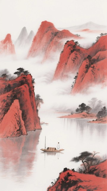 中国传统水墨画风格,以橙红与深紫为主色调,描绘层叠起伏的远山,山间云雾缭绕,呈现出朦胧神秘的氛围,水面上一叶扁舟载着两人,天空中有飞鸟掠过,笔触流畅写意,留白恰到好处,营造出宁静悠远的意境。