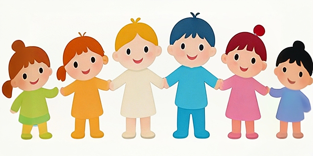 6个不同造型、穿搭和动作的儿童角色,保持Q版可爱插画风格,圆润的头部和身体比例,明亮活泼的色彩搭配,每个孩子都有独特的发型和服饰,如穿着条纹上衣背着书包的男孩、蓝色背带裙的双马尾女孩、手持书本的黄色上衣女孩等,角色表情开心喜悦,动作自然生动,所有角色在白色背景上呈规整横向排列,形成儿童系列素材套系,整体风格统一,充满童真童趣。详情