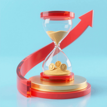 3D渲染风格,金色的人民币符号硬币堆叠成多层圆柱形塔状,部分硬币从塔上滑落或悬浮在空中,一条醒目的红色向上弯曲箭头从左侧低处硬币堆延伸至右侧高处硬币堆顶部,整体呈现出强烈的金属光泽和立体感,光影效果突出硬币的质感和堆叠层次,画面简洁明快,以白色为背景,营造出财富增长和上升趋势的视觉效果。