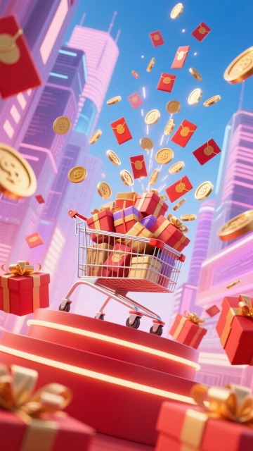 软3D风拟人小羊推购物车,满载礼物与红包,穿梭于喜庆赛道,气球飘扬,彩带飞舞,萌趣十足,传递节日狂欢氛围。