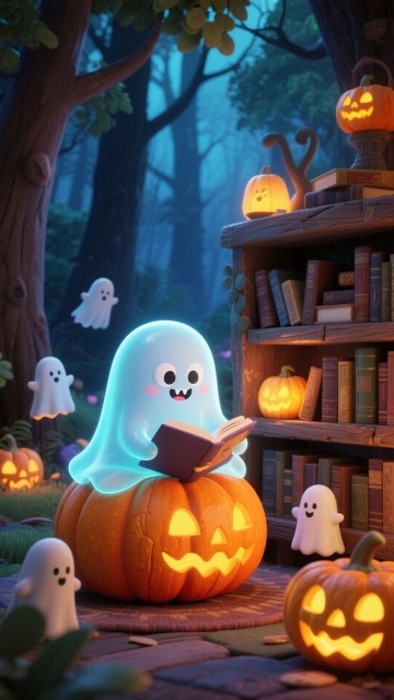 梦幻感与可爱感交织的软3D风格,拟人化小幽灵在南瓜灯环绕的森林书屋中阅读,光影柔和,水彩质感渲染,营造出温馨卡通风的万圣节虚拟现实场景。