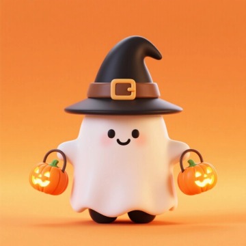 软3D风格的可爱小幽灵,拟人化设计搭配巫师帽与南瓜灯,卡通感十足,节日氛围浓厚。