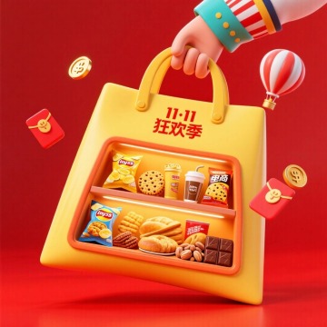 软3D风格零食集合海报,纯色背景,整体色彩变换为清新明亮的马卡龙色系,画面中六个不同类目的零食系列素材规整排布,从左到右、从上到下依次为:袋装薯片,包装袋呈长条形,表面有波浪形纹理和品牌标识,薯片从袋口溢出几片,呈现出酥脆的质感;方形饼干盒,盒身有简约的几何图案装饰,盒盖微微开启,露出内部整齐排列的饼干;圆形曲奇罐,罐身印有花纹,罐口放置几块曲奇饼干,曲奇表面有网格状纹路和巧克力豆点缀;桶装爆米花,桶身设计有条纹图案,爆米花饱满蓬松,从桶口溢出一些;坚果礼盒,礼盒呈长方体,盒面有坚果的插画图案,礼盒旁散落几颗完整的坚果;巧克力礼盒,礼盒为心形,表面有丝带蝴蝶结装饰,盒内整齐排列着不同形状的巧克力,整体视觉层级清晰,各零食元素大小协调,色彩和谐统一,营造出欢快、诱人的氛围,信息传达效率高,符合年轻受众的审美和零食宣传目的,设计感十足。