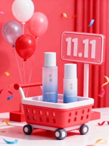 鎏金风与3D微缩艺术结合,金属质感线条勾勒现代奢华,购物车与“11.11”字样呼应双十一大促,科技感光影烘托高端护肤美学。