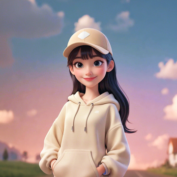 软3D风格的可爱女孩,大眼萌脸搭配清新自然背景,卡通感十足,柔和色调传递舒适氛围,T恤上的四叶草呼应幸运主题。