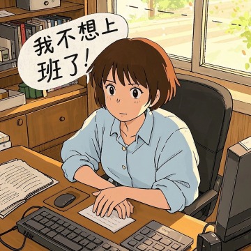 卡通风格插画,拟人化猫咪坐在电脑前,萌趣表达上班烦恼,粉色对话框增添可爱感,轻松幽默传递日常情绪。