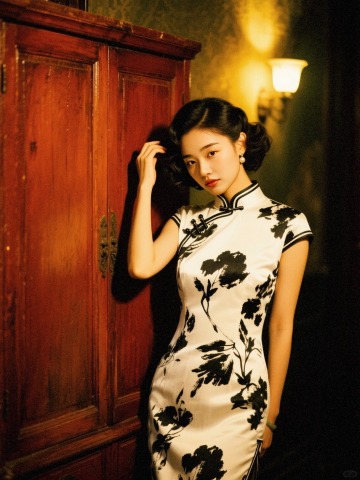 复古中式旗袍,黑花白底,国潮风韵,古典与现代交融。