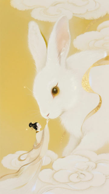 梦幻感与唯美感交织,中式插画风呈现嫦娥与玉兔的国潮拟人形象,水彩晕染搭配鎏金服饰,月光映衬下尽显中秋诗意。