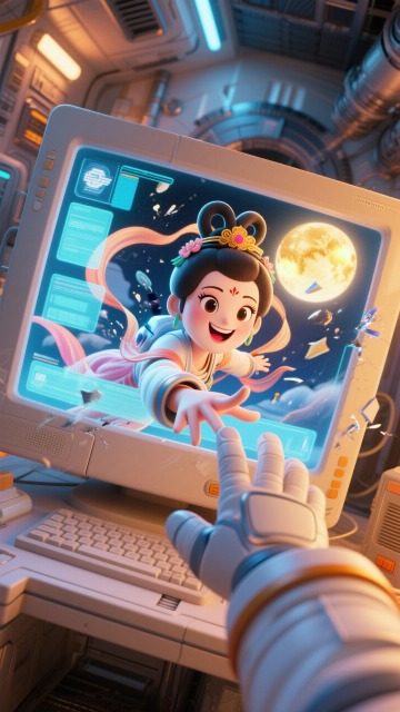 未来感与科技感交织的虚拟现实场景,卡通风格嫦娥从复古电脑屏幕中跃出,3D软塑质感搭配霓虹灯风光影,梦幻而富有动漫风趣味。