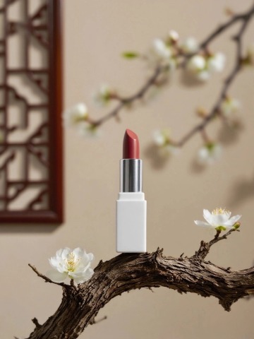 以暖黄为主色调,搭配口红的粉调、瓶身的金棕与花枝的浅黄,营造出温暖、优雅且精致的氛围,尽显美妆品的魅力。