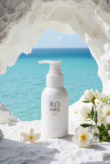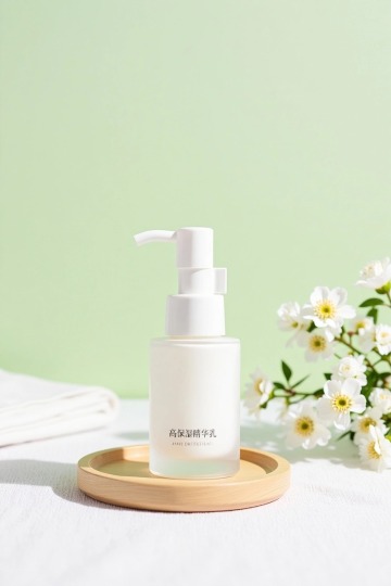 优雅纯净写实风设计,白色精华乳瓶与罗马柱、花植元素结合,营造雅致治愈的护肤展示氛围