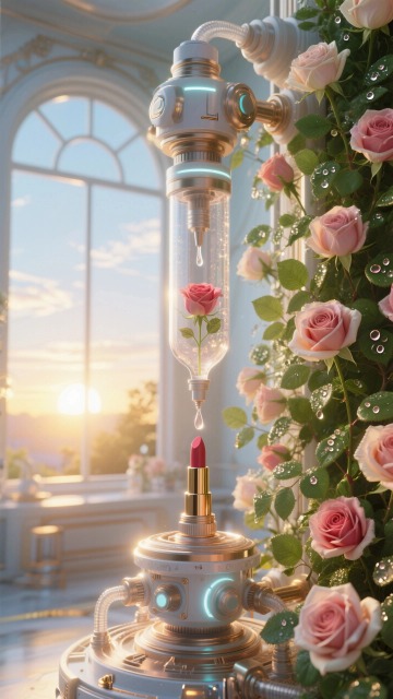 梦幻3D风,未来感机械与浪漫玫瑰交织,液态金属光泽,超现实主义美学。
