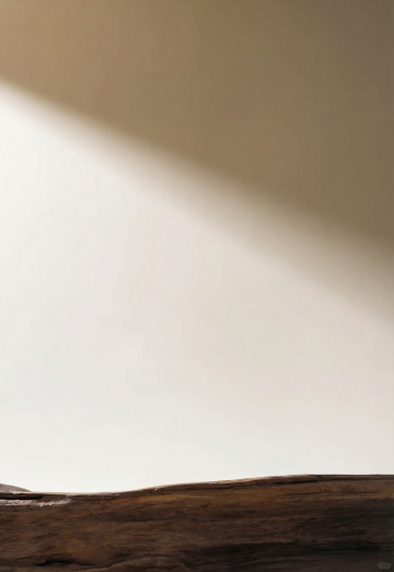 一张木桌的特写镜头,采用极简主义摄影风格,暖色调光线从左侧斜射,在深棕色木纹桌面上形成柔和的光影渐变,桌面边缘可见一本翻开的白色笔记本,右上角有一小株绿色植物的局部枝叶,背景模糊处理,突出木质纹理的细腻质感和简洁宁静的氛围。