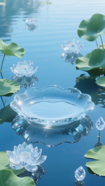 梦幻3D玻璃风荷叶,清新虚拟自然场景,晶莹剔透,夏日清凉。