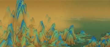 中式意境山水,3D浮雕质感,鎏金松树点缀青玉山峦,云雾缭绕,梦幻朦胧,清透唯美的虚拟自然画卷。