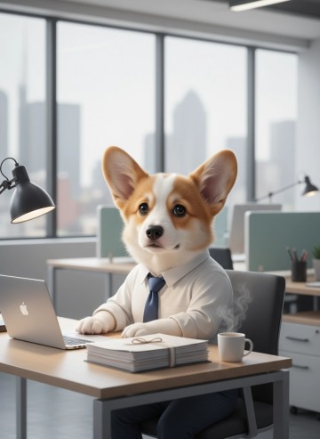 拟人风3D角色,猫咪身着商务西装,手握咖啡杯,办公桌前专注工作,展现职场幽默感。