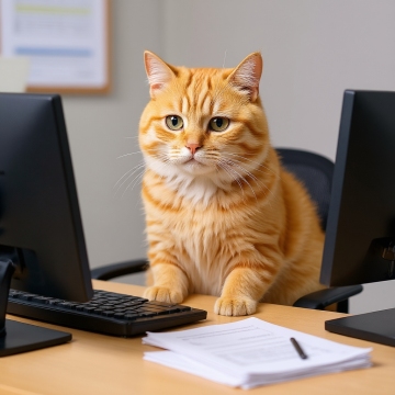 拟人风猫咪坐于办公桌前,重拟物风格呈现实景感,商务氛围中透出柔和舒适,印刷质感细节精致,尽显职场萌趣。