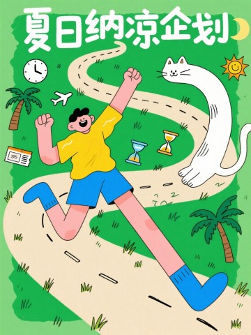 夏日纳凉企划,清新卡通插画风,人物与猫咪活力奔跑,展现轻松愉悦的假期氛围。