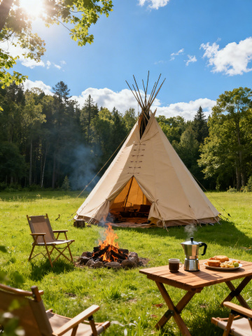 一张写实风格的露营场景照片,明亮的阳光下,湖边草地中央搭建着一个米黄色的尖顶帐篷,帐篷前摆放着一套黑色金属框架折叠桌椅,桌面上放着透明玻璃杯。远处是连绵起伏的青灰色山脉,山间点缀着墨绿色的森林,近处湖边有几棵高大的绿色松树,前景是长满黄色野花的绿色草地。天空湛蓝,飘着几缕白色的云朵,整体画面色彩清新明快,光影层次分明,营造出宁静自然、舒适惬意的户外露营氛围。