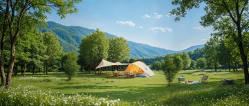 阳光透过茂密的绿色树叶洒下斑驳光影,在开阔的绿色草地上,布置着一个米色帆布帐篷和一个带遮阳棚的露营帐篷,帐篷周围摆放着原木色折叠桌椅,桌上铺着格纹餐布,旁边散落着几个彩色靠垫和一本翻开的书,整体呈现出自然、宁静、舒适的户外露营氛围,高清晰度,写实风格,温暖色调,柔和光线,丰富的细节纹理。