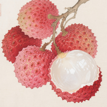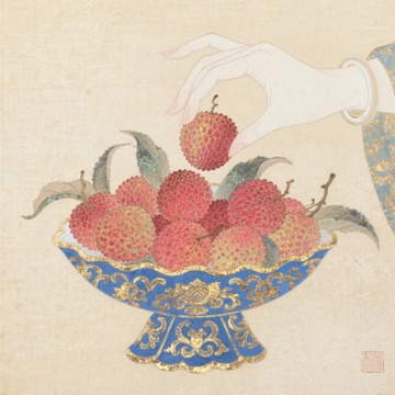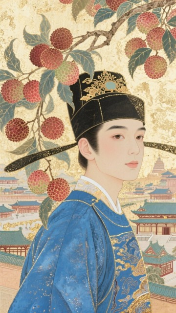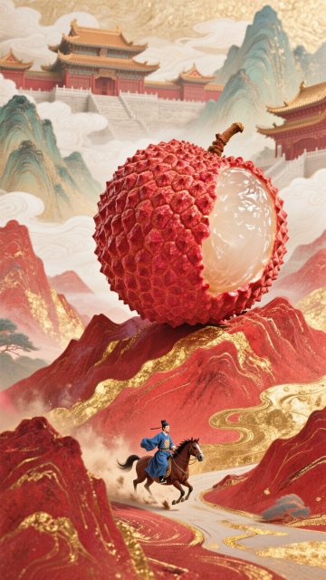 工笔风融合国潮美学,以重拟物手法呈现荔枝与仙侠人物,水墨意境中透出刺绣质感,古典优雅间流淌梦幻唯美之韵。
