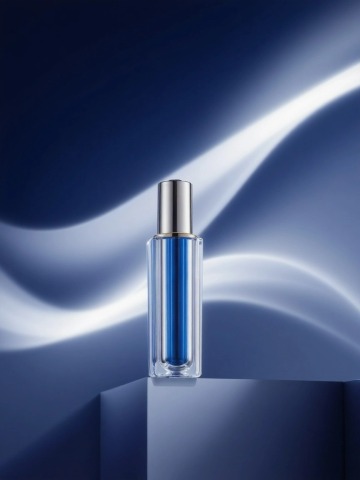 鎏金液态风与3D重拟物设计结合,蓝金交织的未来感护肤瓶,奢华科技感十足,极繁主义光影演绎高端质感。