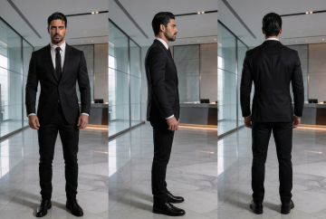 一位戴着黑色头戴式耳机(带麦克风)的男性客服人员,身着黑色修身西装外套(单排双扣,左胸有口袋)和白色衬衫,双手自然交叠于身前,面带温和微笑,站姿挺拔端正。背景为纯浅灰色,光线均匀柔和,人物面部和服装细节清晰,具有高度写实的人像摄影风格,画面简洁专业,突出客服职业形象。
