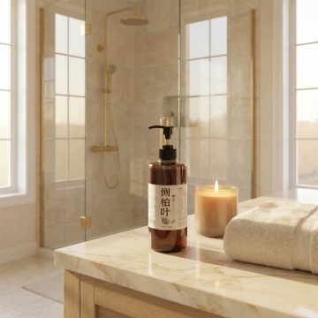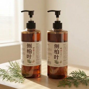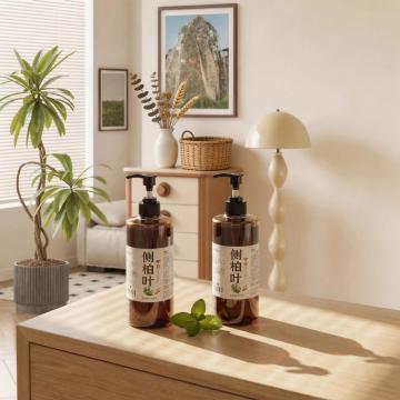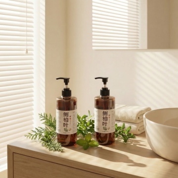 洗发水海报,两瓶深棕色透明液体洗发水瓶,带有黑色按压泵头和白色标签,标签上有黑色文字和金色装饰,瓶身放置在浅棕色木质树枝上,树枝下方有湿润的水面和石头,旁边点缀着绿色植物枝叶和根茎,整体采用温暖的棕黄色调,柔和的侧光照明,营造出自然、有机、纯净的氛围,背景为渐变的米黄色,画面具有清晰的视觉层次,突出产品主体,光影效果细腻,水面有清晰的倒影,质感写实,设计简约自然,传达出天然、植物萃取的产品特性。