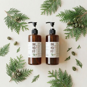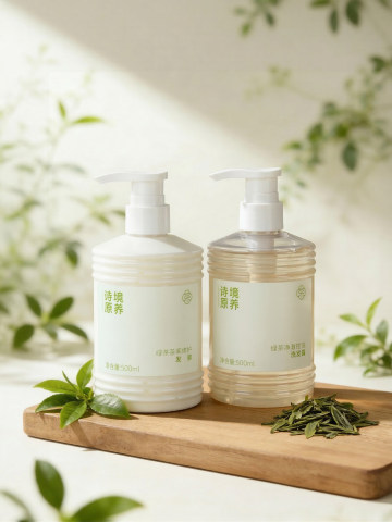 洗发水海报设计,两瓶深绿色透明液体洗发水瓶,搭配黑色按压泵头和白色标签,标签上有黑色文字与金色装饰细节,瓶身优雅放置于浅棕色木质树枝上。树枝下方是清澈湿润的水面,点缀着光滑石头,周围环绕着鲜活的绿色植物枝叶与根茎。整体采用清新自然的绿色调,柔和的侧光照明营造出宁静、有机、纯净的氛围,背景为渐变浅绿色。画面视觉层次清晰,以产品为绝对主体,光影效果细腻,水面呈现清晰的瓶身倒影,整体质感写实,设计简约自然,传达出天然植物萃取的产品特性。