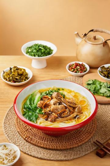 超写实美食摄影风格,一碗热气腾腾的中式面条,深棕色浓郁汤汁,面条被木筷挑起呈现自然垂坠感,碗中点缀大块炖煮至软烂的酱色肉块、翠绿香菜和葱花,碗边散落鲜红完整干辣椒,背景为古朴木质纹理与中式格栅窗的模糊剪影,整体暖色调(棕红、赭石、暖黄为主),侧上方柔和主光源形成明显高光与阴影对比,突出食物质感与立体感,大面积留白处理增强画面呼吸感与简约高级感,木质桌面纹理清晰,整体氛围温暖诱人,细节丰富,色彩和谐统一。