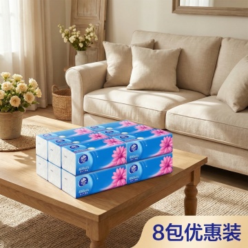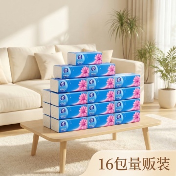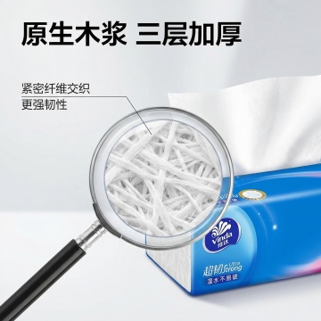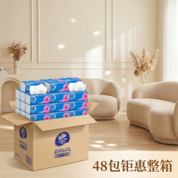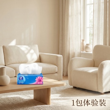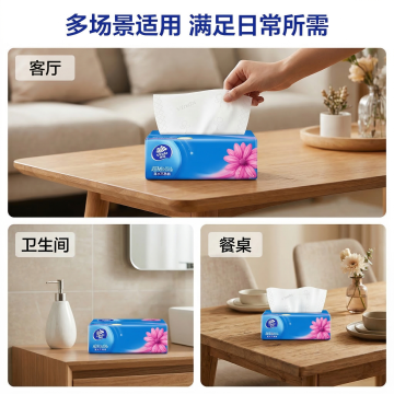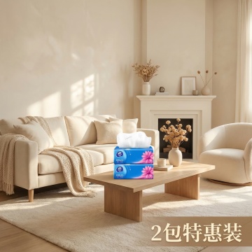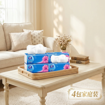 生成一张纸巾电商主图。复制多个主体堆叠在展台上,背景为虚化客厅,自然打光。商品卖点“原生木浆 亲肤无刺激”。画面下方为黄绿渐变配色文本框,展示卖点信息“24包/箱 实惠耐用湿水不易破”。