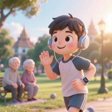 3D风卡通男孩悬浮于透明玻璃质感轨道,佩戴耳机畅享音乐,未来感科技线条环绕,塑料光泽与虚拟现实元素交织,清新绿调营造轻盈梦幻氛围。