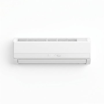 一台挂壁式空调产品图,纯白色机身,表面光滑有细腻的哑光质感,正面下方设有长条形出风口,内部透出柔和的浅蓝色灯光,空调整体呈现简洁现代的设计风格,安装在纯白色背景上,画面光线均匀柔和,无阴影,突出空调的轮廓和细节,无任何文字、logo、二维码及其他装饰元素,专注于展示空调的产品形态和纯净外观。