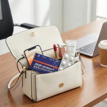 现代感皮质托特包,简约主义设计,光影交错凸显质感,商务与优雅并存,重拟物风实景呈现,时尚大气。